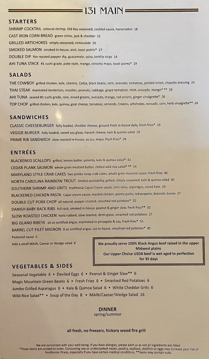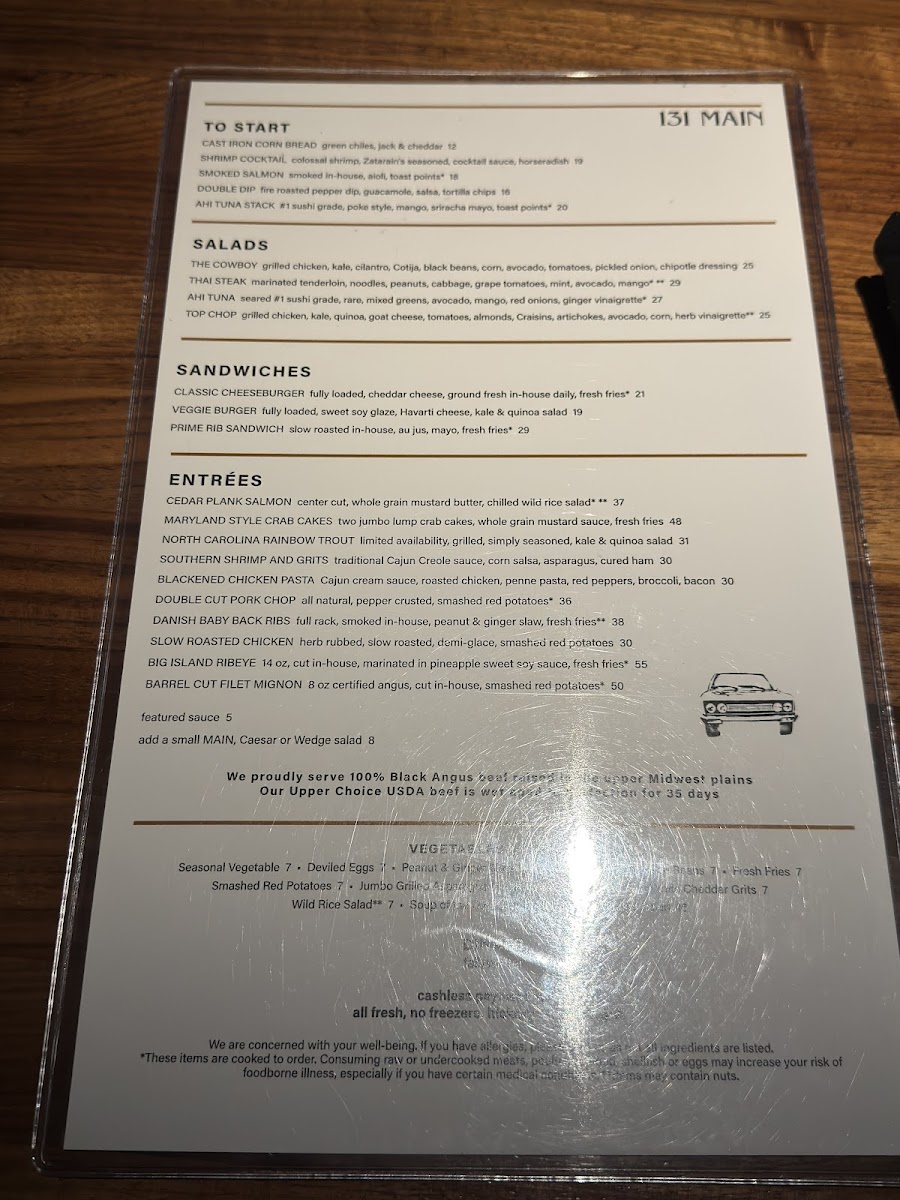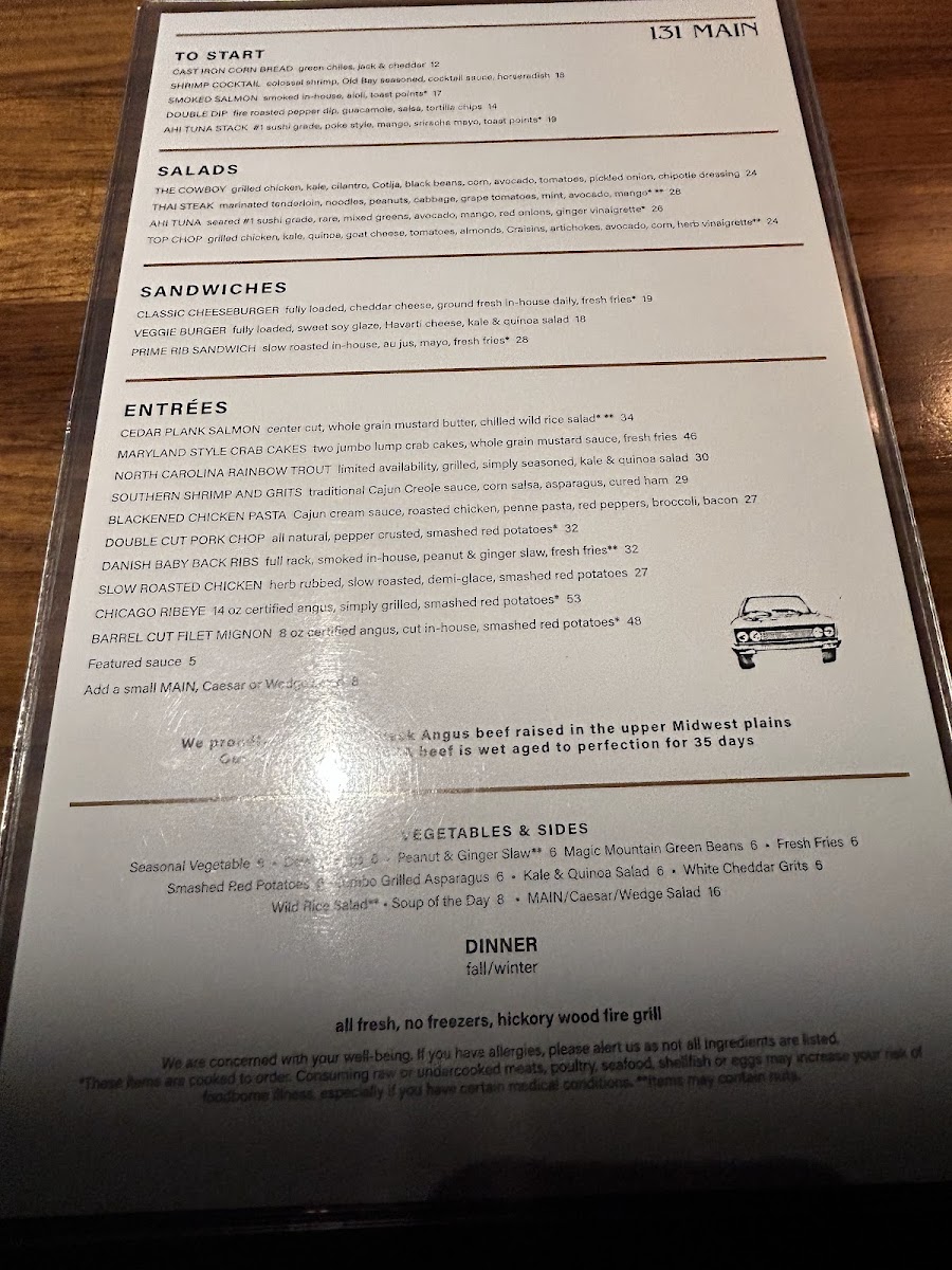 The menu at 131 MAIN Restaurant offers a thoughtfully crafted selection that balances classic American fare with refined New American influences. Guests can expect a range of dishes that feel both familiar and thoughtfully elevated, perfect for enjoying a leisurely lunch or a relaxed yet polished dinner.